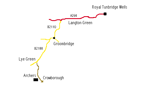 | Directions to Archers: From Royal Tunbridge Wells, take the A264 west through Langton Green, continue on the same road, which becomes the B2110, and at Groombridge, turn right at the mini roundabout. Just before the road bends sharply to the right, turn left towards Crowborough onto the B2188. Proceed under a railway bridge, onto Lye Green and turn left at fork signposted for Crowborough. The road dips down and then turns into a hill. After about 3/4 of a mile, at the brow of the hill, look out on the right hand side for a white sign for Archers. Turn right into the lane and the house is found after a short distance on the left hand side. Click here for an online map. |